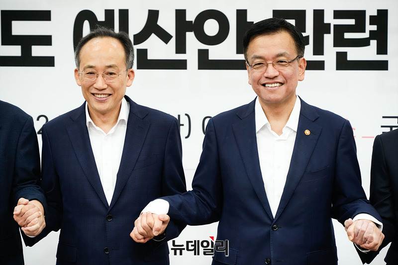추경호 국민의힘 원내대표와 최상목 경제부총리 겸 기획재정부 장관을 포함한 참석자들이 20일 오전 서울 여의도 국회에서 열린 2025년도 예산안 관련 당·정협의회에서 기념촬영을 하고 있다.