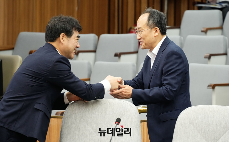 추경호 국민의힘 원내대표가 20일 오전 서울 여의도 국회에서 열린 원내대책회의에 참석하며 인사를 나누고 있다.