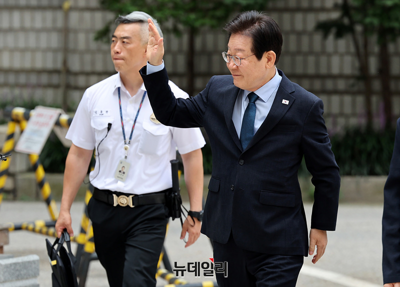 이재명 더불어민주당 신임 당대표가 20일 오전 서울 서초구 서울중앙지방법원에서 열린 '대장동 배임·성남FC 뇌물 의혹' 관련 공판에 출석하며 지지자들에게 손을 들어 인사하고 있다.
