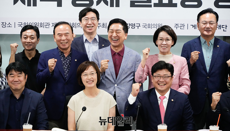 강명구 국민의힘 의원, 추경호 국민의힘 원내대표를 비롯한 참석자들이 20일 오후 서울 여의도 국회 의원회관에서 열린 장애인 게임 접근성 향상을 위한 세액 공제 필요성 정책토론회에서 기념촬영을 하고 있다.