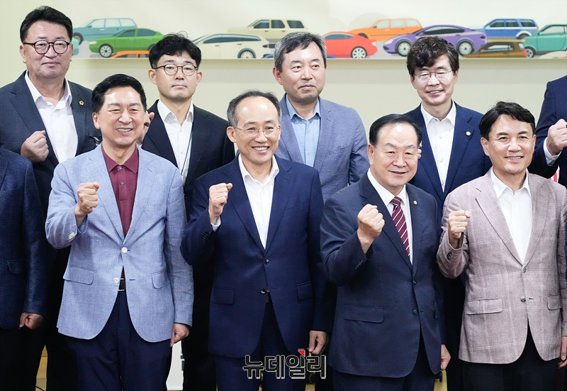추경호 국민의힘 원내대표, 한기호 의원, 김진태 강원지사를 비롯한 참석자들이 20일 오후 서울 여의도 국회 의원회관에서 '경기·강원 북부권 도로 이대로 좋은가'를 주제로 열린 토론회에서 기념촬영을 하고 있다.