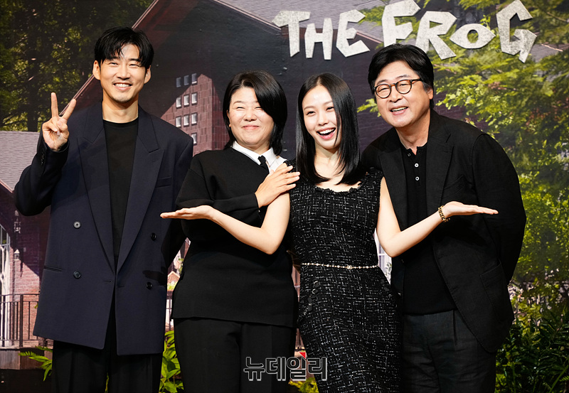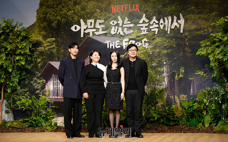 배우 이정은, 고민시, 윤계상, 김윤석이 21일 오전 서울 강남구 조선팰리스에서 열린 넷플릭스 오리지널 시리즈 '아무도 없는 숲속에서' 제작발표회에서 포즈를 취하고 있다.