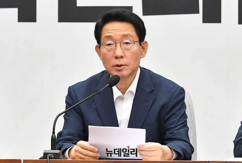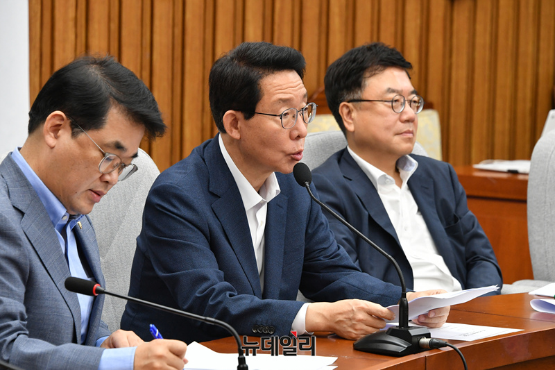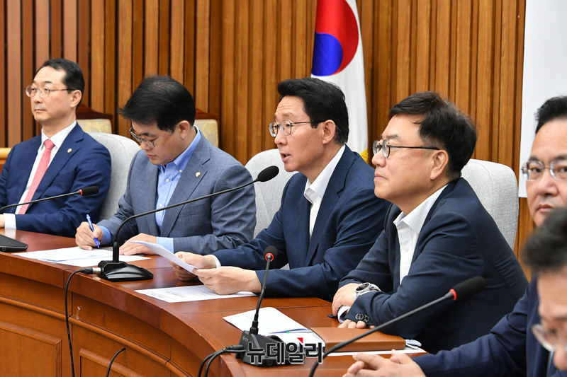 김상훈 국민의힘 정책위의장이 23일 오전 국회에서 열린 원내대책회의를 주재하고 있다. 이날 김 의장은 "기준금리 결정은 한은 금융통화위원회의 고유권한"아라며 "한은이 충분히 여러 경제 상황을 감안해 결정했을 것으로 생각하고 이를 존중한다"고 밝혔다.