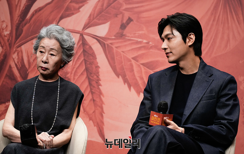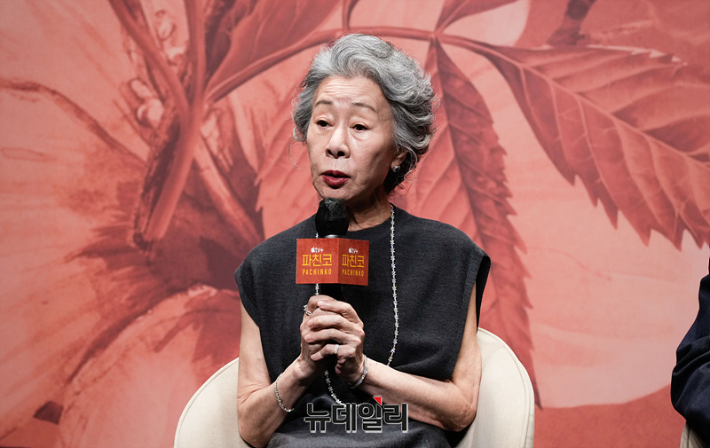 배우 윤여정, 이민호, 김민하, 정은채, 김성규가 23일 서울 강남구 그랜드 인터컨티넨탈 서울 파르나스에서 열린 Apple TV+ '파친코 시즌 2' 프레스 컨퍼런스에서 취재진의 질문에 답하고 있다.