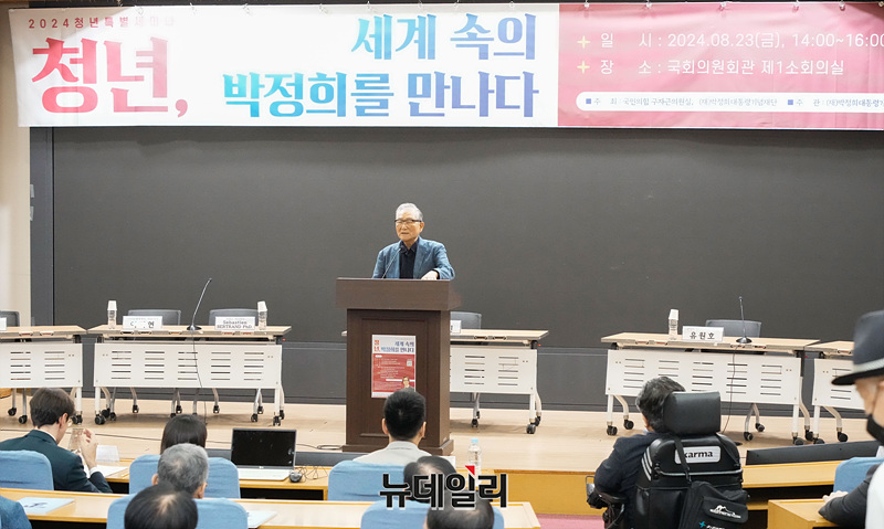 손병두 대한민국사랑회 이사장이 23일 오후 국회 의원회관에서 열린 '청년, 세계 속의 박정희를 만나다' 세미나에서 인사말을 하고 있다.