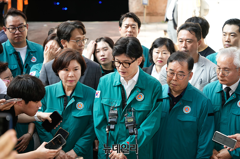 한동훈 국민의힘 대표가 23일 오후 경기 부천시 숙박시설 화재현장을 둘러본 뒤 취재진의 질문에 답하고 있다.