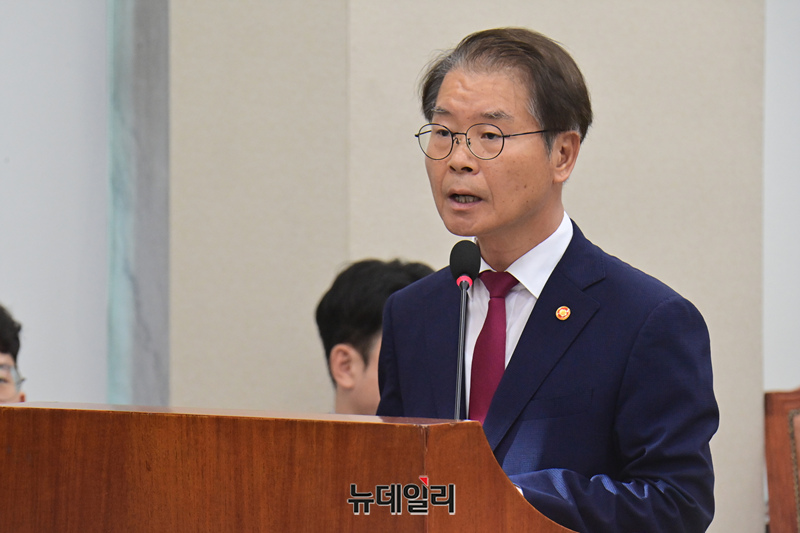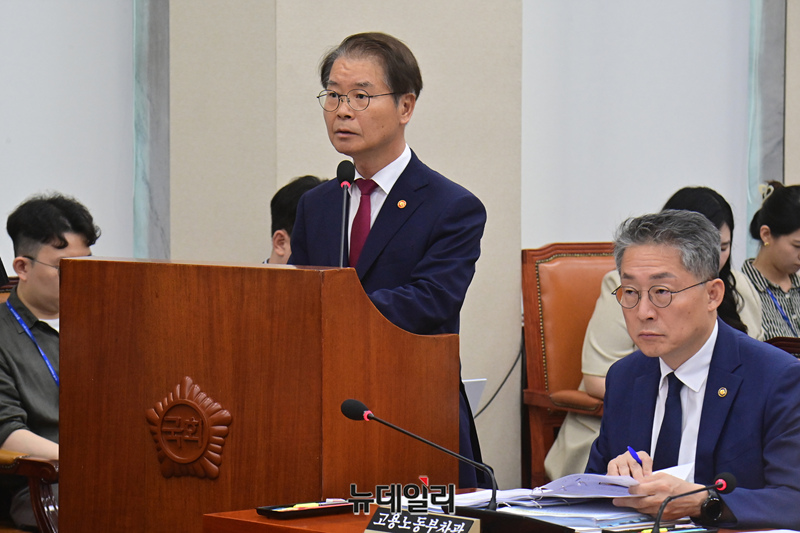 이정식 고용노동부 장관이 26일 오전 국회에서 열린 환경노동위원회 2차 전체회의에 출석해 2023회계연도 결산 보고를 하고 있다.