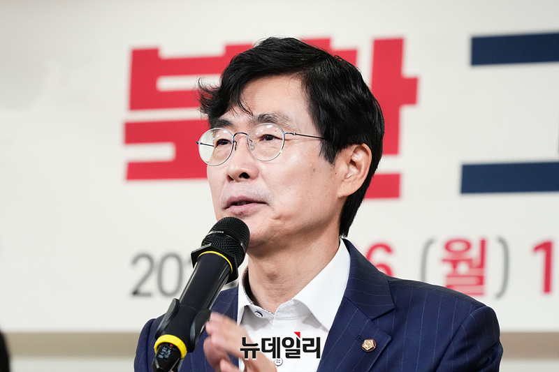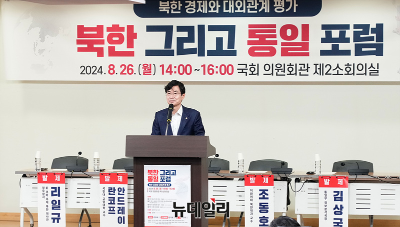 조경태 국민의힘 의원이 26일 오후 서울 여의도 국회에서 북한 경제와 대외관계 평가를 주제로 열린 '북한 그리고 통일 포럼'에서 축사를 하고 있다.