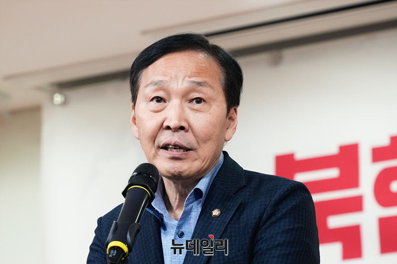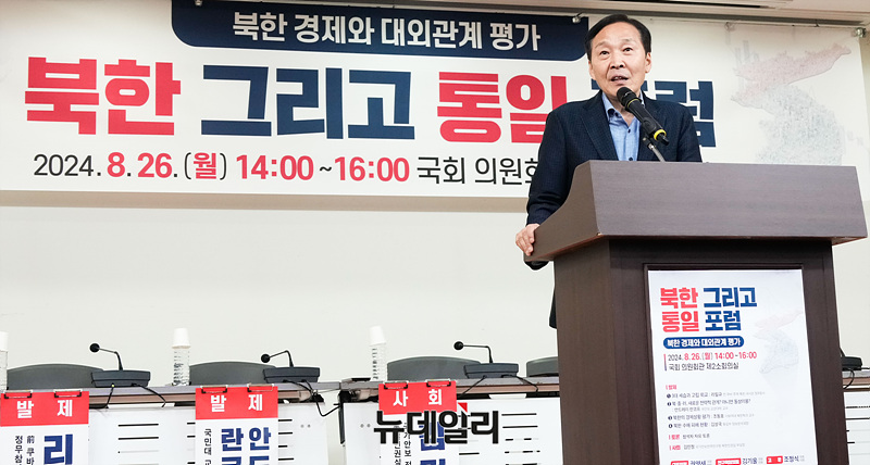 김기웅 국민의힘 의원이 26일 오후 서울 여의도 국회에서 북한 경제와 대외관계 평가를 주제로 열린 '북한 그리고 통일 포럼'에서 환영사를 하고 있다.