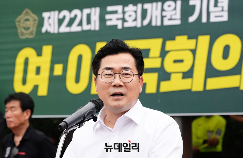 박찬대 더불어민주당 원내대표가 26일 오후 서울 여의도 국회 운동장에서 열린 제22대 국회개원 기념 여야 국회의원 축구대회에서 축사를 하고 있다.