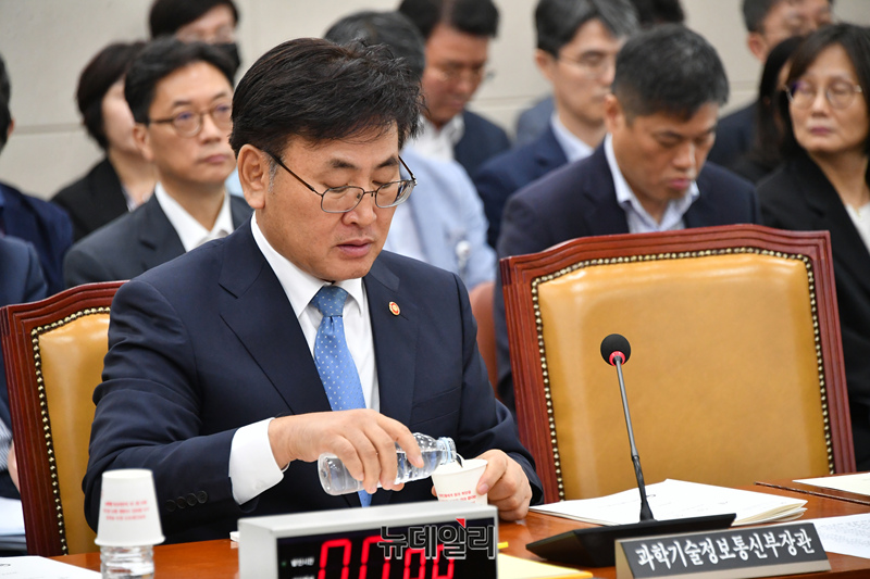 유상임 과학기술정보통신부 장관이 27일 오전 국회에서 열린 과학기술정보통신위원회 전체회의에서 물을 마시고 있다.