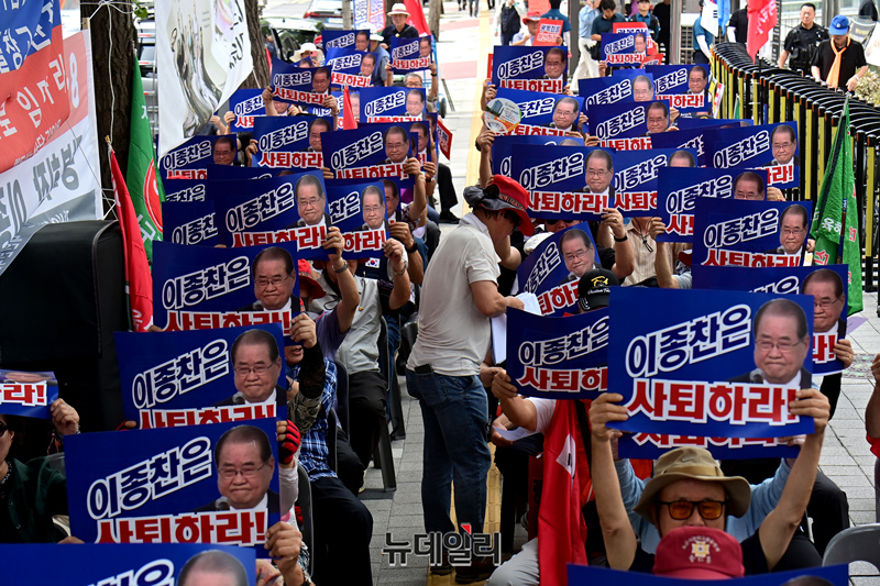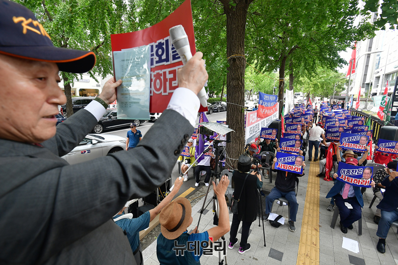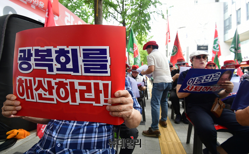 이종찬 광복회장 망언 규탄 집회가 27일 오후 서울 여의도 광복회관 앞에서 전군구국동지연합회, 고교연합 주최로 열리고 있다.이날 행사에는 육군사관학교총구국동지회, 해군사관학교 구국동지회, 공군사관학교 구국동지회, 해병대 장교구국동지회, 국균간호사관국 구동지회, 육군3사관학교 국구동지회, 갑종장교 구국동지회, 간부사 관구국동지회, 기술행정사관구국동지회, 육군학사장교구국동지회, 해군 OCS구국동지회, 공군학사장교구국동지회, ROTC구국동지회 등이 참석했다.