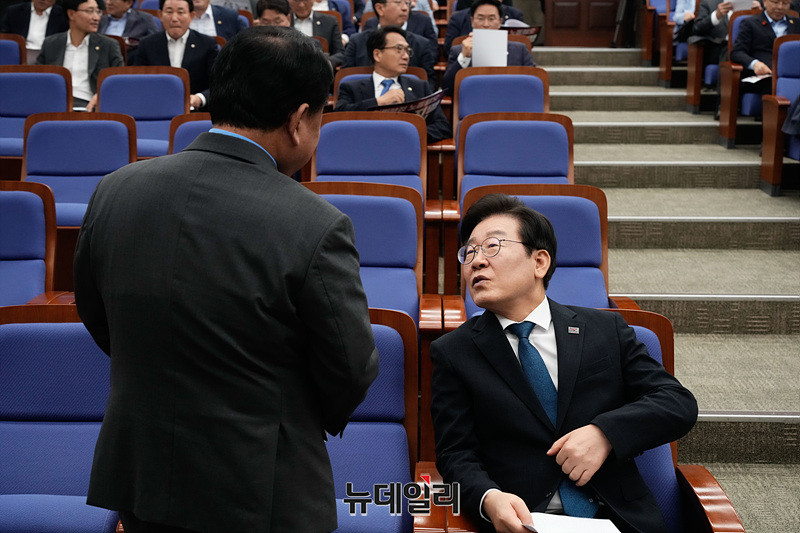 이재명 더불어민주당 대표가 28일 오후 서울 여의도 국회에서 열린 의원총회에서 김병주 최고위원과 대화를 나누고 있다.