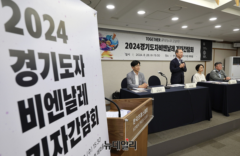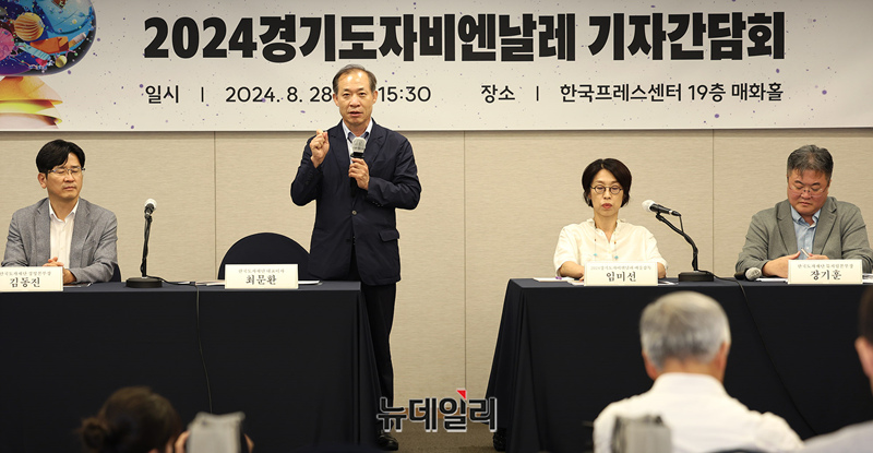 최문환 한국도자재단 대표가 28일 오후 서울 중구 한국프레스센터에서 열린 '2024 경기도자비엔날레' 기자간담회에서 행사 방향성을 소개하고 있다.최 대표 "이번 비엔날레는 그 어느 때보다 '협력과 공존'이라는 시대적 메시지를 담아내고자 했다. 도자는 오랜 시간 인류의 문화를 잇고, 다양한 민족과 국가를 연결해 온 예술 매체다. 이번 행사를 계기로 도자를 통해 우리가 잃어버린 협력의 가치를 되새기고, 서로 다른 생각과 문화 속에서도 함께 살아가는 지혜를 찾는 계기가 되길 바란다"며 "비엔날레 기간 전 세계의 다양한 작가들이 선보이는 도자예술 작품들을 통해 깊은 감동과 새로운 시각을 경험하길 바란다"고 말했다.'2024 제12회 경기도자비엔날레'는 '투게더_몽테뉴의 고양이'를 주제로 9월 6일부터 10월 20일까지 경기 이천, 여주, 광주 등에서 개최된다.