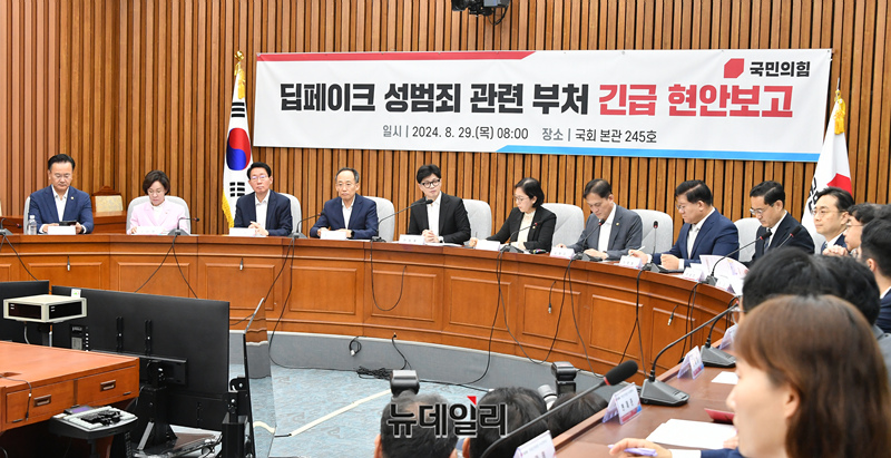 한동훈 국민의힘 대표가 29일 오전 국회에서 열린 '딥페이크 성범죄 관련 부처 긴급 현안보고' 회의에서 발언을 하고 있다.