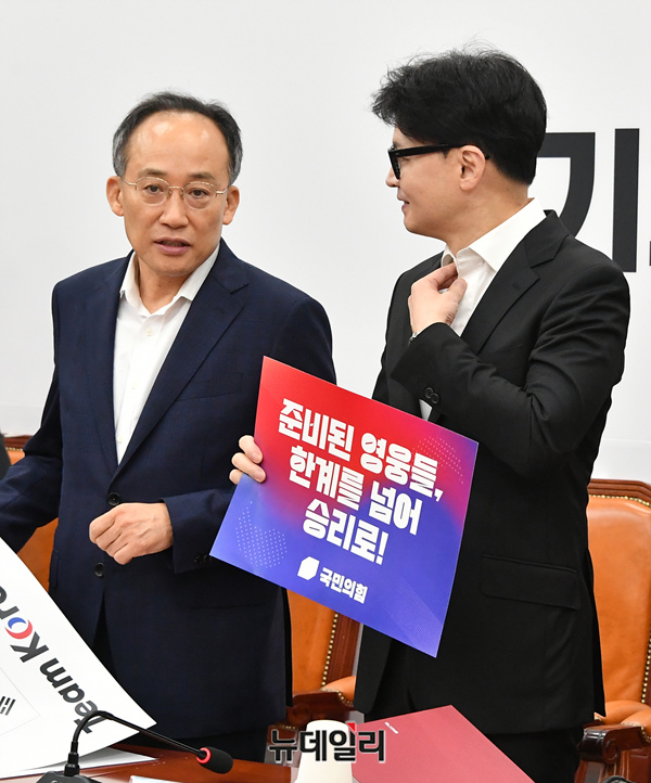한동훈 국민의힘 대표와 추경호 원내대표가 29일 오전 국회에서 최고위원회의에서 대화를 나누고 있다.
