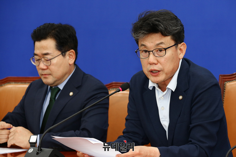 진성준 더불어민주당 정책위의장이 29일 국회에서 열린 원내대책회의에서 모두발언을 하고 있다.