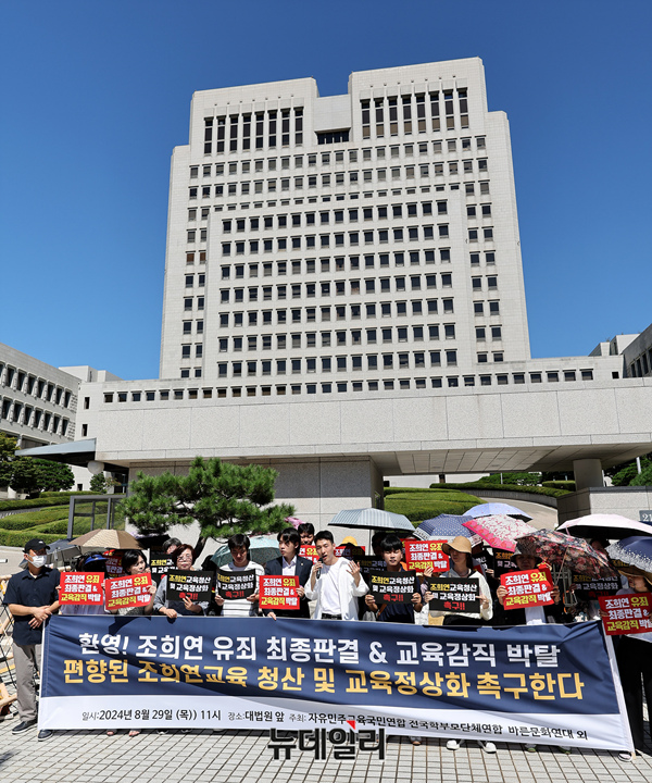 자유민주교육국민연합(상임공동대표 김태영, 박소영)이 29일 오전 서울 서초구 대법원 앞에서 해직교사 특혜 채용으로 기소된 조희연 서울교육감 상고심에 앞서 기자회견을 갖고 있다.