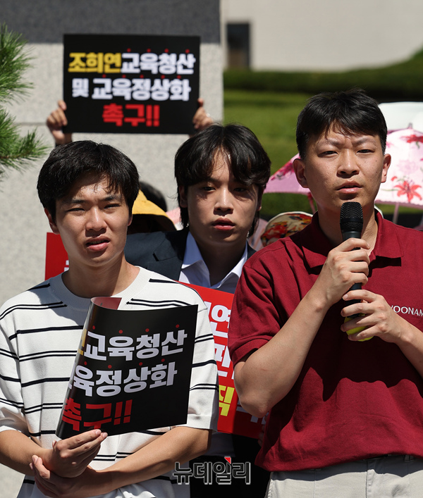 최인호 관악구의원이 조희연 서울교육감의 상고심 선고일인 29일 오전 서울 서초구 대법원 앞에서 자유민주교육국민연합(상임공동대표 김태영, 박소영) 주최로 열린 교육 정상화 촉구 기자회견에서 발언하고 있다.
