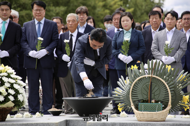 전병헌 새로운미래 대표가 29일 경남 김해시 봉하마을 고(故) 노무현 전 대통령 묘역을 찾아 헌화하고 있다. (사진=새로운미래)