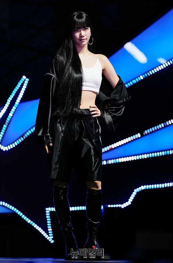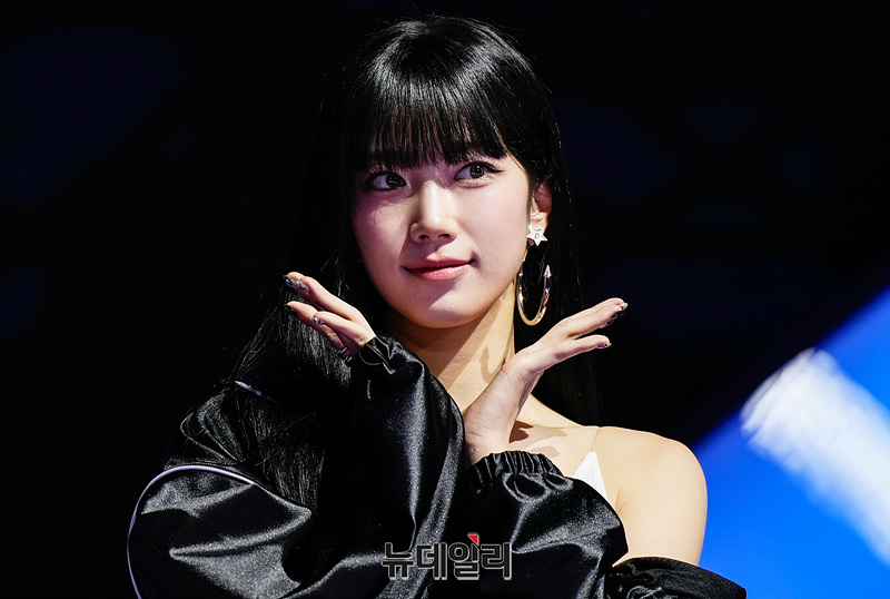 걸그룹 르세라핌 카즈하가 29일 오후 서울 광진구 예스24 라이브홀에서 열린 네 번째 미니앨범 '크레이지(CRAZY)' 발매 기념 쇼케이스에서 포즈를 취하고 있다.