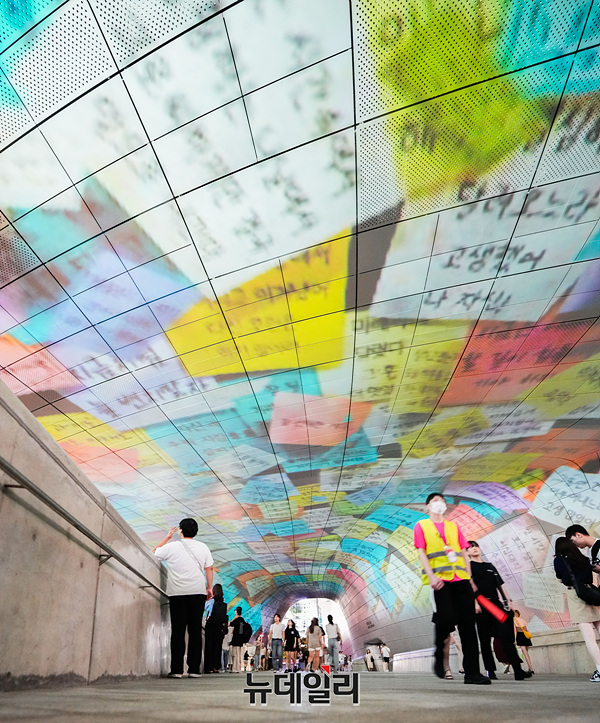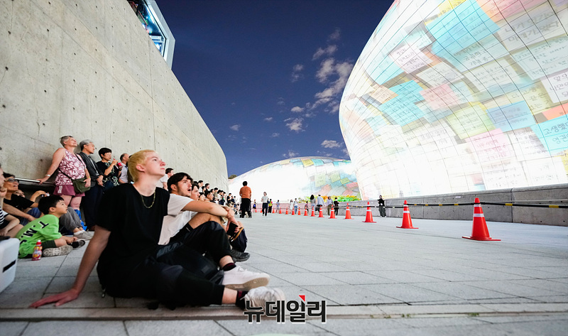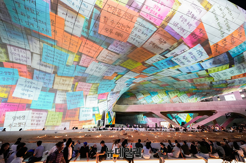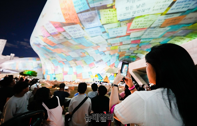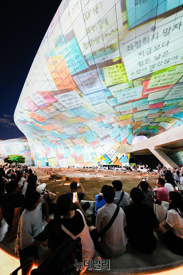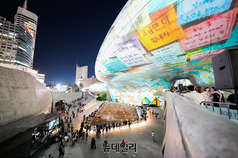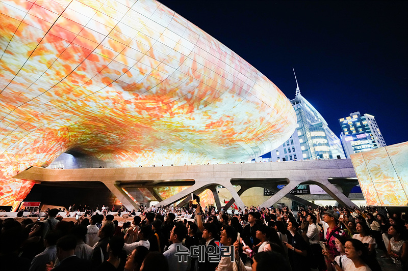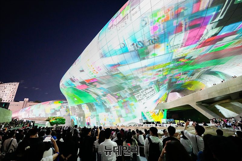 서울라이트 DDP 2024 가을이 개막한 29일 오후 서울 중구 동대문디자인플라자(DDP) 외벽에 미디어파사드 영상이 상영되고 있다. 9월 8일까지 DDP에서 매일 저녁 8시에서 10시까지 30분마다 무료로 진행된다.