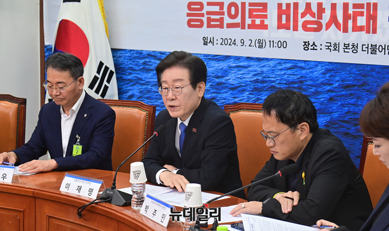 이재명 더불어민주당 대표가 2일 오전 국회에서 의료대란대책특위·대한응급학회 응급의료 비상사태 간담회에서 발언하고 있다.