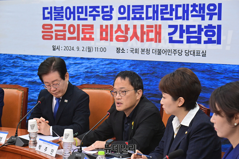박주민 더불어민주당 의료대란대책특별위원장이 2일 오전 국회에서 의료대란대책특위·대한응급학회 응급의료 비상사태 간담회에서 발언하고 있다.