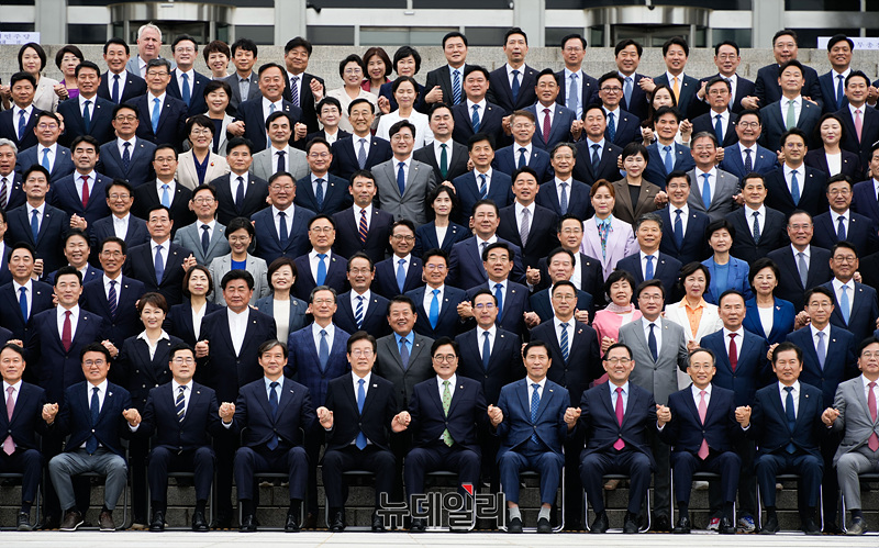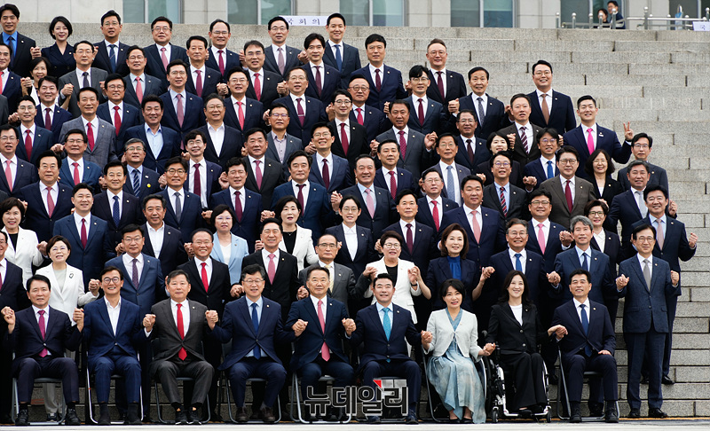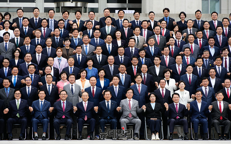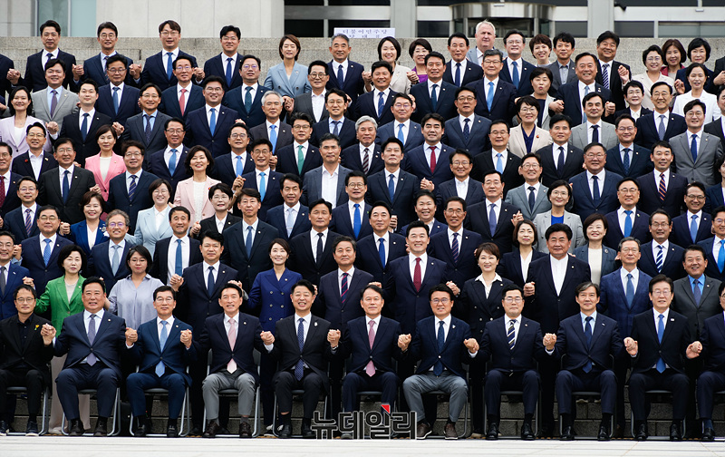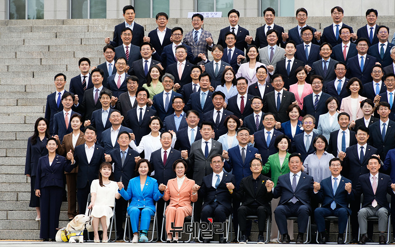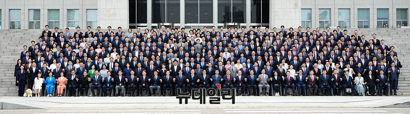 우원식 국회의장과 의원들이 2일 오후 서울 여의도 국회의사당에서 열린 제22대 국회 개원식 겸 9월 정기국회 개회식을 마치고 기념촬영을 하고 있다.