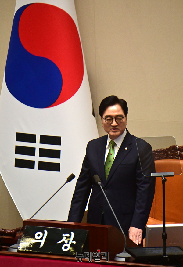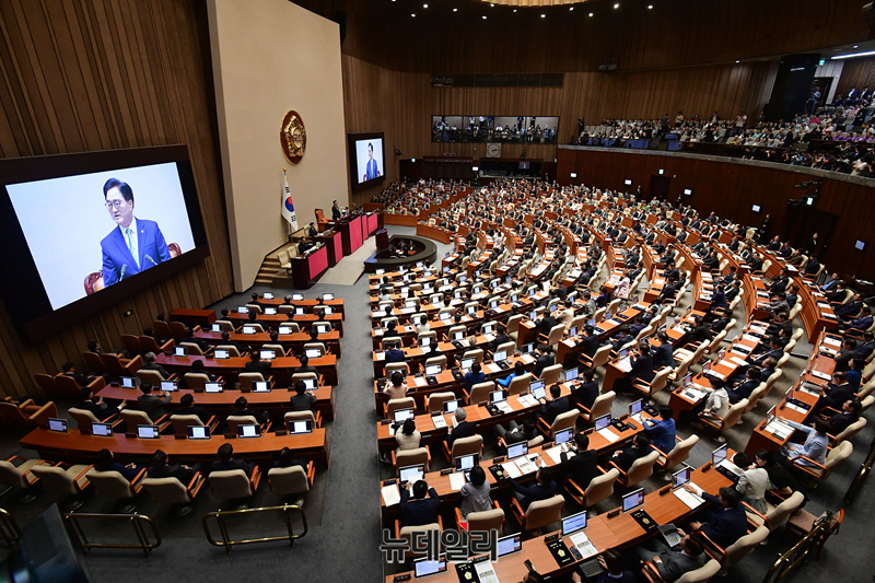 우원식 국회의장이 2일 오전 국회 본회의장에서 열린 제22대 국회 개원식 겸 개회식에서 연설을 하고 있다.
