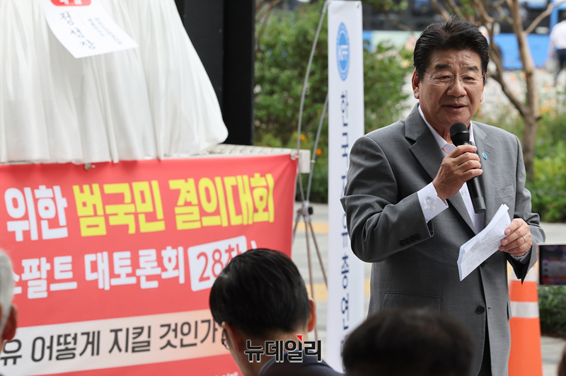 강석호 한국자유총연맹 총재가 2일 오후 서울 동화면세점 앞에서 열린 '북핵 위협 대응, 자유 수호를 위한 범국민 결의대회'에서 발언하고 있다.