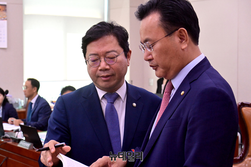 유상범 국회 법제사법위원회 여당 간사와 김승원 야당 간사가 3일 오전 국회 법제사법위원회에서 열린 인사청문회에서 심우정 검찰총장 후보자의 자료제출을 두고 논의하고 있다.