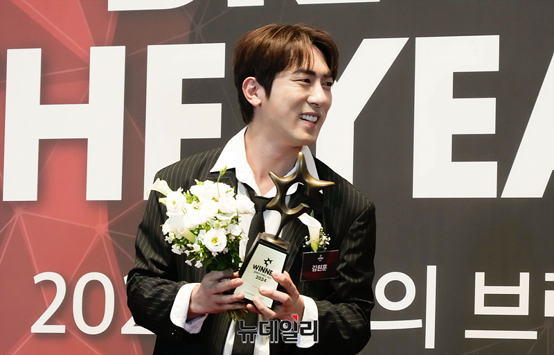 개그맨 김원훈이 3일 오후 서울 중구 신라호텔에서 열린 '2024 올해의 브랜드 대상' 시상식에서 포즈를 취하고 있다.