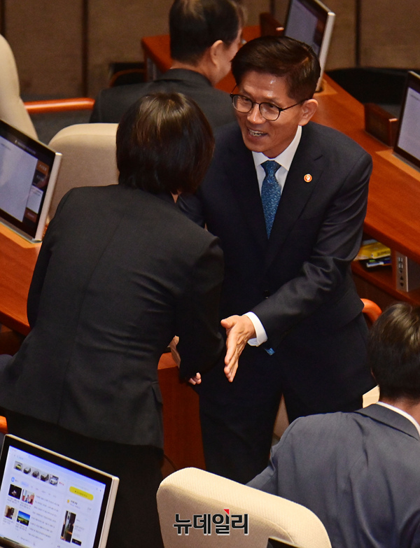 김문수 고용노동부 장관이 4일 오전 국회에서 열린 본회의에서 의원들과 인사를 나누고 있다.