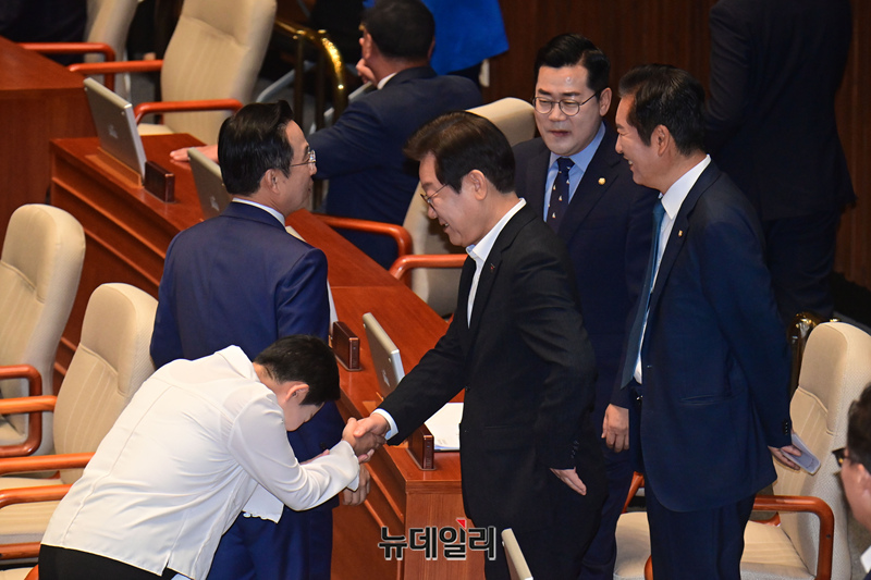 [포토] 의원들과 인사 나누는 이재명 민주당 대표