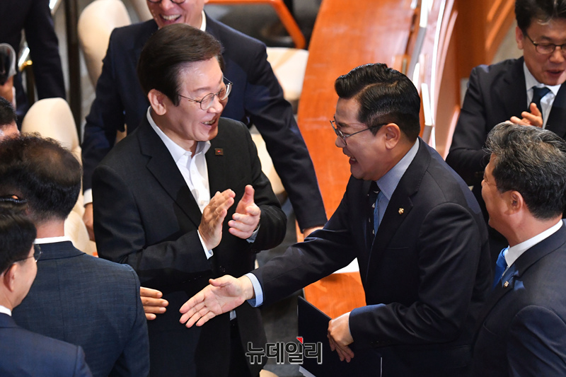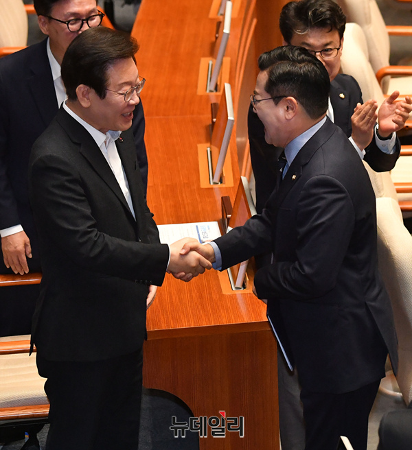 [포토] 교섭단체 대표연설 마치고 이재명 찾은 박찬대