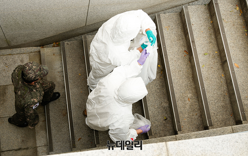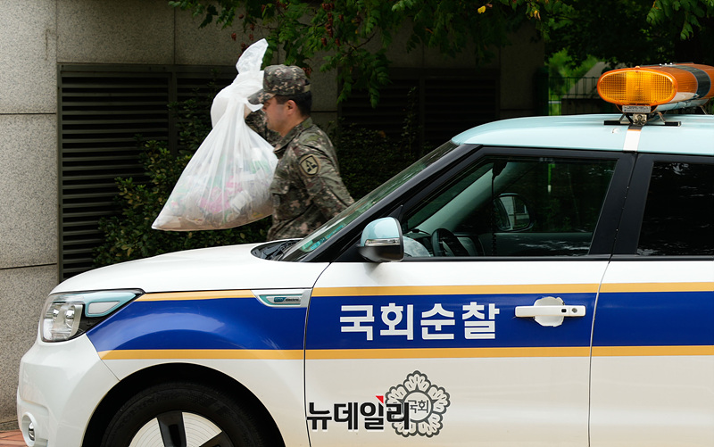 북한이 오물풍선을 다시 띄운 5일 오전 서울 여의도 국회에서 군 관계자들이 오물풍선 잔해를 수거하고 있다.