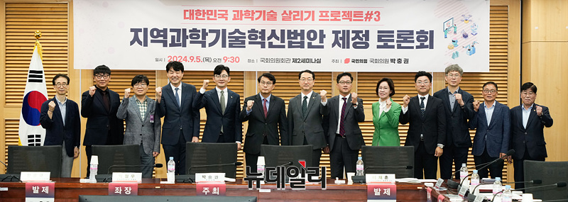 박충권 국민의힘 의원, 윤상현 의원을 비롯한 참석자들이 5일 오전 서울 여의도 국회에서 열린 '지역과학기술혁신법안 제정 토론회'에서 기념촬영을 하고 있다.