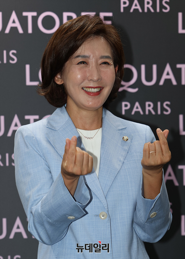 나경원(동작을) 국민의힘 의원이 5일 오후 서울 강남구 루이까또즈 산하 문화재단 '플랫폼엘 컨템포러리 아트센터'에서 열린 현대 미술가 '토비아스 레베르거' 개인전 '천둥이라 불러줘' 기념 행사에 참석해 포즈를 취하고 있다. 패션 브랜드 루이까또즈는 토비아스 레베르거와 협업한 콜라보레이션 에디션을 선보였다.