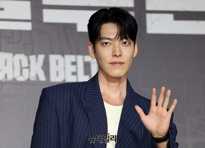 배우 김우빈이 10일 오전 서울 광진구 롯데시네마 건대입구에서 열린 넷플릭스 영화 '무도실무관(감독 김주환)' 제작보고회에서 포즈를 취하고 있다.