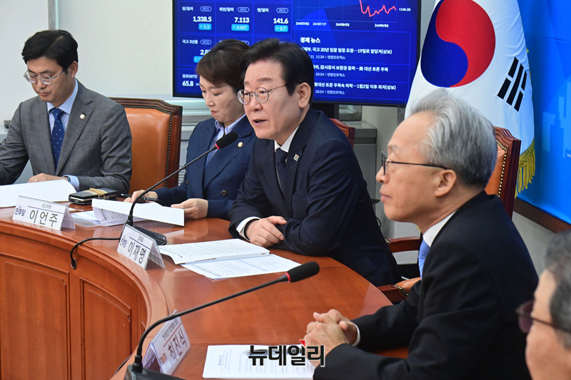 이재명 더불어민주당 대표가 11일 오전 국회에서 열린 더불어민주당-한국중견기업연합회 민생경제 간담회에서 모두발언을 하고 있다.