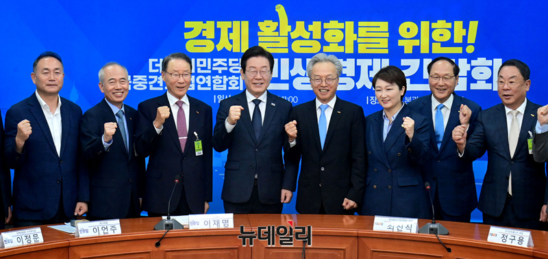 이재명 더불어민주당 대표와 최진식 한국중견기업연합회장 등 참석자들이 11일 오전 국회에서 열린 더불어민주당-한국중견기업연합회 민생경제 간담회에서 모두발언을 하고 있다.
