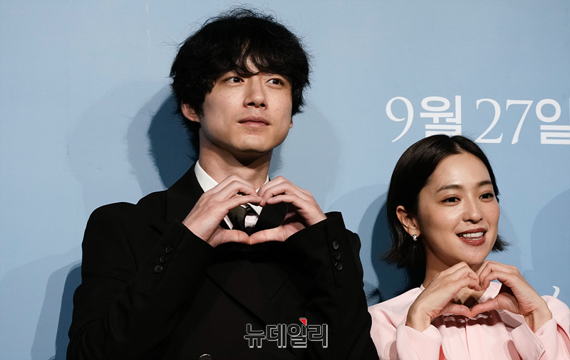 문현성 감독(가운데), 일본배우 사카구치 켄타로(왼쪽부터), 나카무라 안, 한국배우 이세영, 홍종현이 12일 오전 서울 중구 웨스틴 조선 호텔에서 열린 쿠팡플레이 시리즈 '사랑 후에 오는 것들' 제작발표회에서 포즈를 취하고 있다.