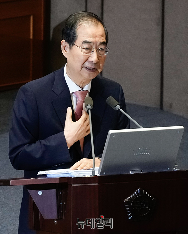 한덕수 국무총리가 12일 오후 서울 여의도 국회 본회의장에서 열린 교육·사회·문화 분야 대정부질문에 출석해 의원들의 질문에 답하고 있다.