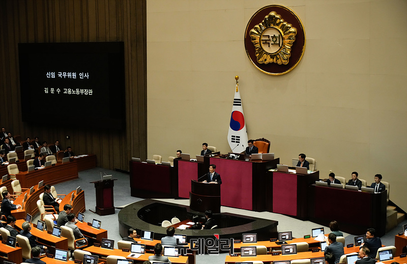 김문수 고용노동부 장관이 12일 오후 서울 여의도 국회 본회의장에서 열린 교육·사회·문화 분야 대정부질문에 앞서 인사말을 하고 있다.