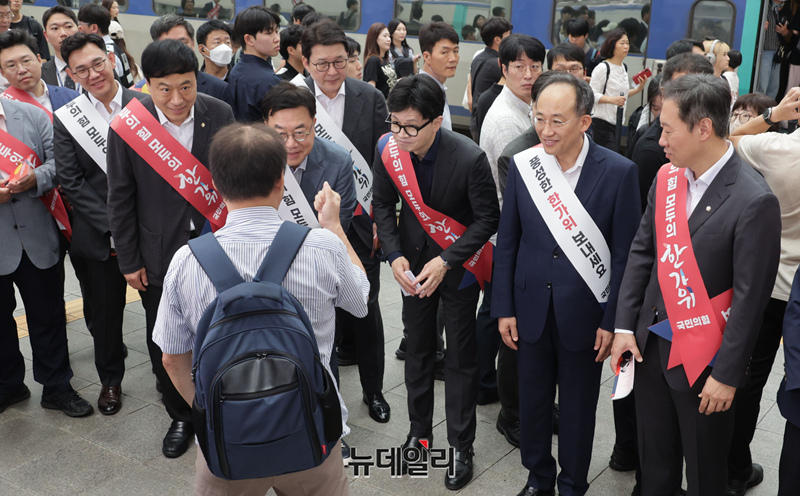 [포토] 귀성객들과 인사 나누는 한동훈 국민의힘 대표 및 지도부