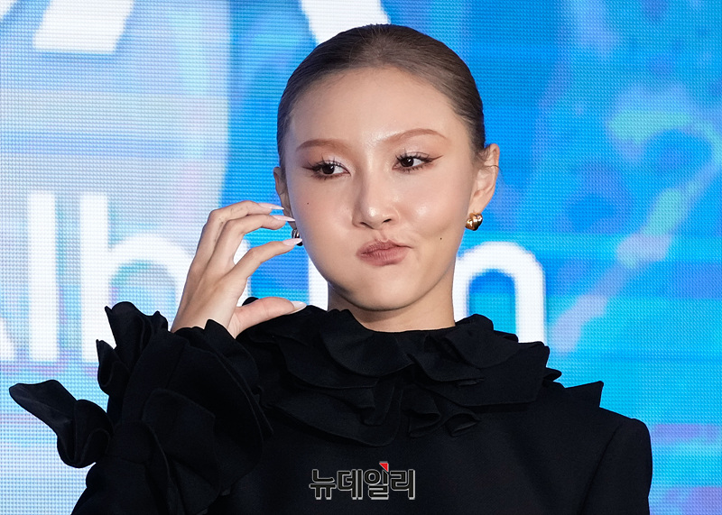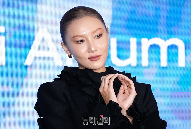 가수 화사가 19일 오후 서울 여의도 콘래드 호텔에서 열린 두 번째 미니앨범 'O(오)' 발매 기념 기자간담회에서 포즈를 취하고 있다.