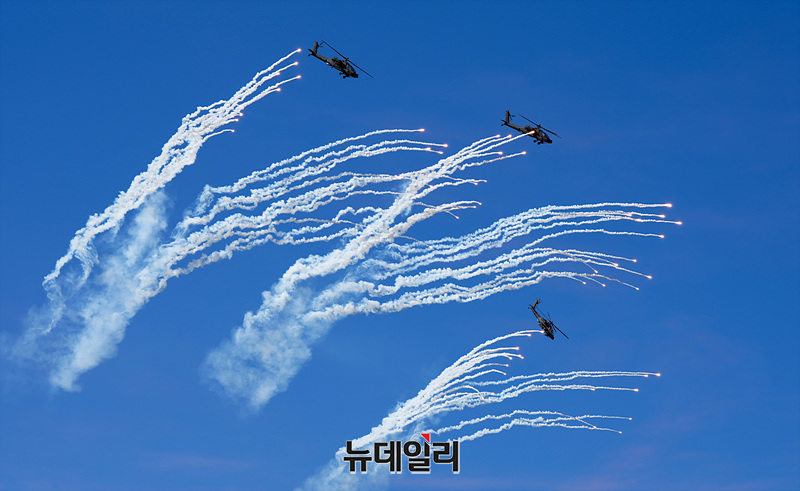 대한민국 육군 AH-64 공격헬기 편대가 23일 오전 서울공항에서 진행된 국군의날 축하비행 예행연습에서 플레어를 뿌리며 기동하고 있다. (경기 성남=서성진 기자)