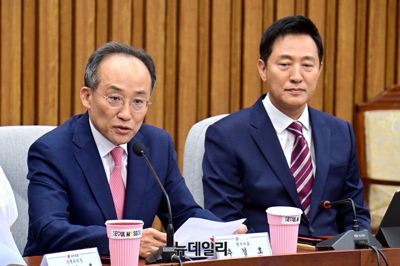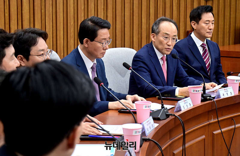 추경호 국민의힘 원내대표가 23일 오후 국회에서 열린 국민의힘·서울특별시 예산정책협의회에서 발언을 하고 있다.