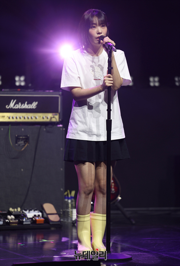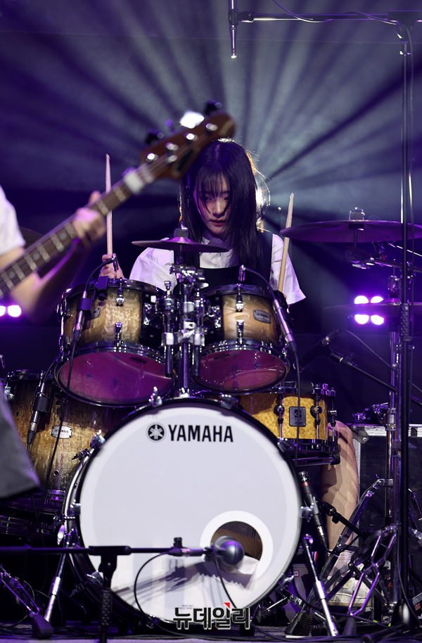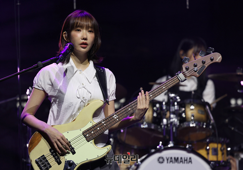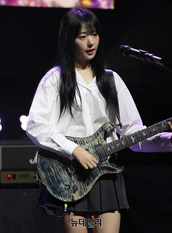 밴드 QWER이 23일 오후 서울 서대문구 예스24 원더로크홀에서 열린 2번째 미니앨범 쇼케이스에서 수록곡 무대를 선보이고 있다.